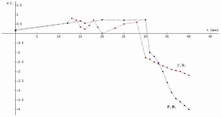 Рис.2. Кусочно-линейная графическая интерпретация изменений вегетативного индекса у обоих испытуемых (У.Н. и Р.М.) на начальной фазе пролонгированного коитуса на фоне ваджроли мудры.